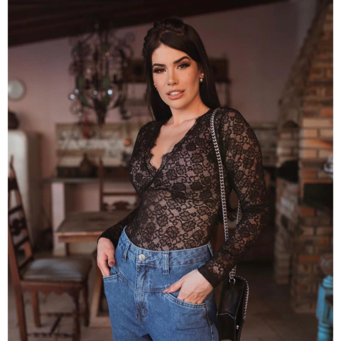 Body todo em renda com bojo e mangas compridas.